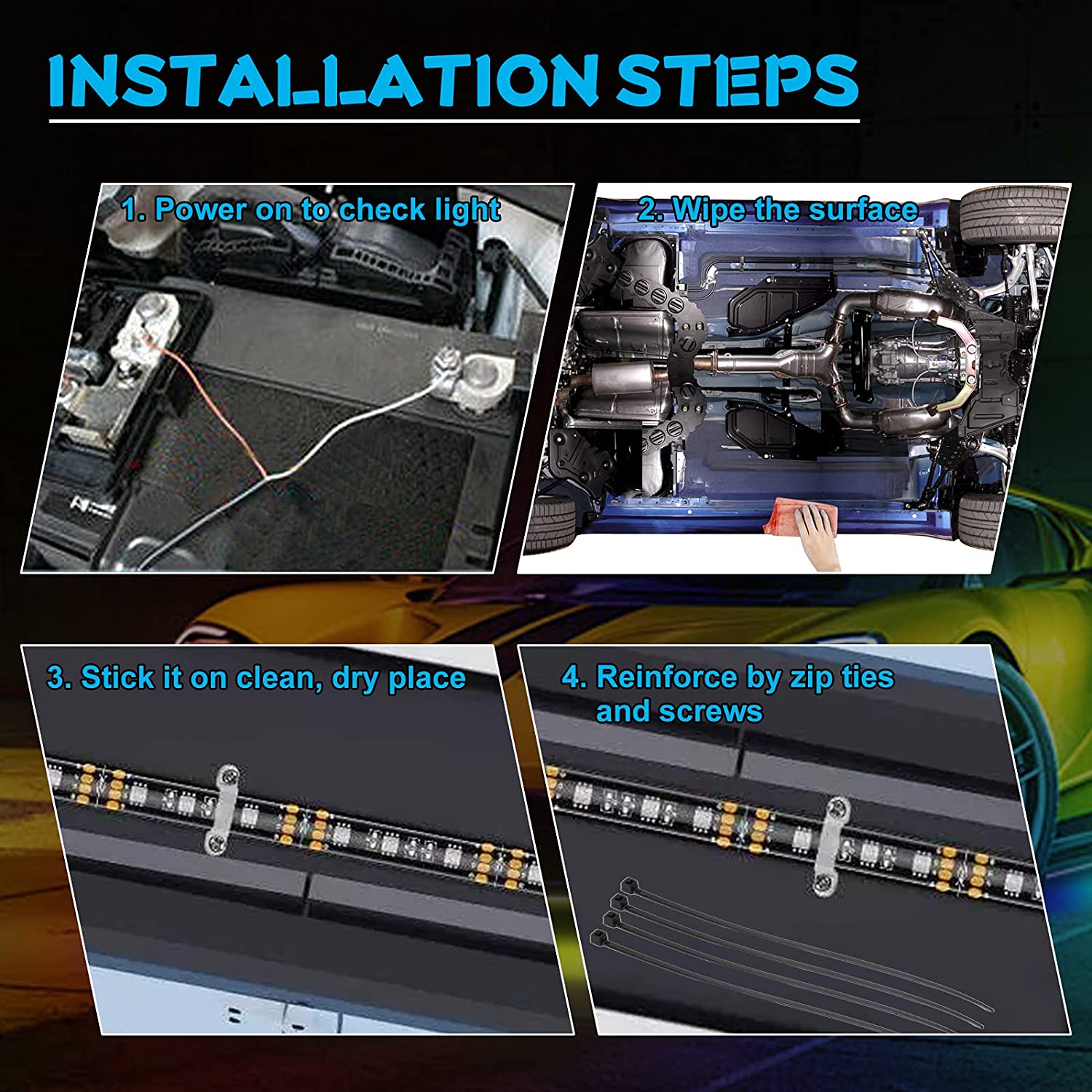 App Control & 16 Million Colors: Our Underglow Lights use wireless APP for control suitable for IOS or Andriod. Choose any color you like from 16 million colors. APP control to turn lights on or off, dim or brighten and even adjust the speed of mode.
